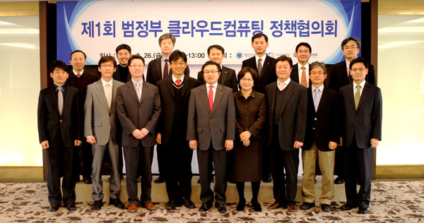 방송통신위원회와 행정안전부, 지식경제부는 함께 클라우딩 컴퓨팅 활성화에 협력키로 했다. 앞줄 왼쪽부터 한재선 한국클라우팅컴퓨팅 연구조합 이사장, 김성호 한국클라우드서비스협회 책임, 홍진배 방통위 과장, 김회수 행안부 과장, 임종태 SKT 네트워크기술원 원장, 이영희 KT 본부장, 김양우 동국대학교 교수, 박찬익 포항공과대학교 교수, 양병내 지경부 과장, 뒤줄 왼쪽부터 손덕주 한국전자통신연구원 책임, 염헌영 서울대학교 교수, 윤찬현 KAIST 교수, 강선무 한국정보화진흥원 단장, 김종완 LG CNS 부문장, 임철수 산업기술평가관리원 PD, 이재일 한국인터넷진흥원 단장
