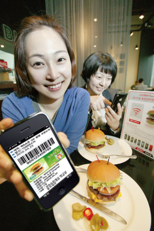고객이 ‘쿡앤쇼존’이 구축된 크라제버거에서 프로모션에 참여해 기프티쇼를 내려받아 이용하고 있다.