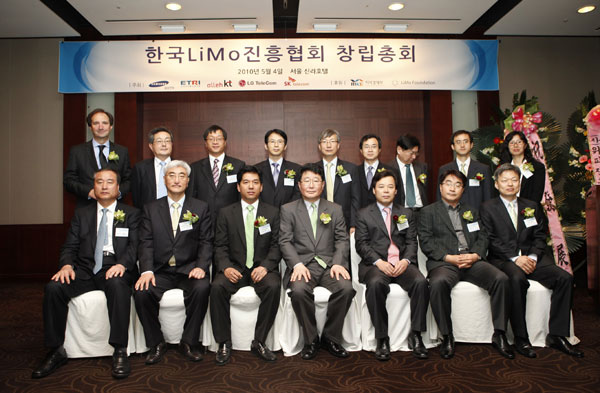 ‘한국LiMo진흥협회’가 마침내 출범했다. 4일 협회 창립총회 후 참석자들이 기념사진을 찍고 있다.<앞줄 좌측부터>KT 이경수 사업본부장, ETRI 김흥남 원장, SKT 김후종 상무, 지경부 조석 실장, SKT 홍성철 부문장, 삼성전자 김종인 상무, LGT 이상민 상무, <뒷줄 좌측부터>LiMo재단 모건 길스 이사장, 한국정보통신기술협회 진병문 본부장, 한국무선인터넷솔루션협회 김종식 회장, 지경부 박재득 PD, 지경부 이현우 PD, KT 김진대 상무, ETRI 황승구 소장, 지경부 유법민 과장, ETRI 김선자 팀장