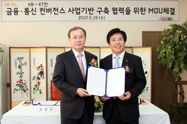 4 KT 기업고객부문장 이상훈 사장(오른쪽))과 KB국민은행 신용카드그룹 최행현 부행장이 19일 KT 광화문빌딩에서 금융/통신 컨버전스 사업기반 구축 협력을 위한 MOU를 맺고 기념촬영하고 있다. (Visited 9 times, 1 visits today)