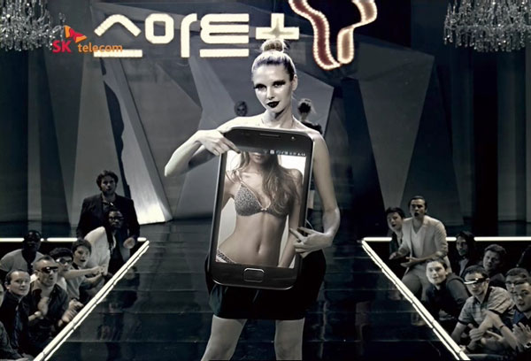 SK텔레콤이 내보내고 있는 스마트폰 CF중 한 장면. 모델이 갤럭시S를 소개하고 있다.