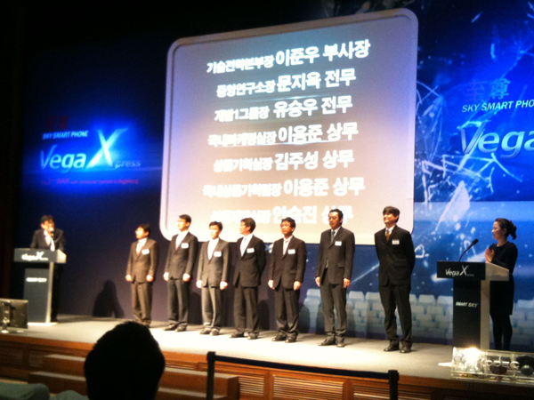 21일 ‘베가 엑스’ 발표회에서 팬택 임성재 전무가 각 부문장들을 소개하고 있다.