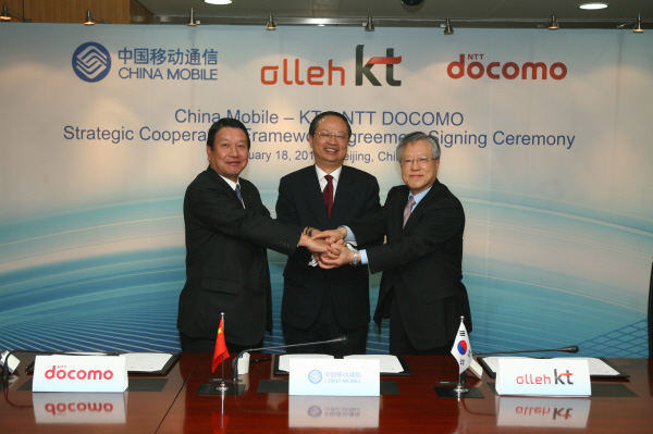 6 ← Previous Next → KT와 차이나모바일, NTT도코모는 18일 중국 베이징시 차이나모바일 본사에서 전략적 협정을 맺고 로밍, 앱스토어, 스마트폰 등 다양한 분야에서 협력키로 했다. 왼쪽부터 야마다 류지 NTT도코모 사장, 왕 젠저우 차이나모바일 회장, 이석채 KT 회장 (Visited 1 times, 1 visits today)