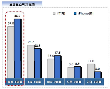 LG와 스카이, 모토로라에서 애플(아이폰)로 브랜드 스위칭 한 비중은 각각 22.9%, 17.5%, 8.9%였다.