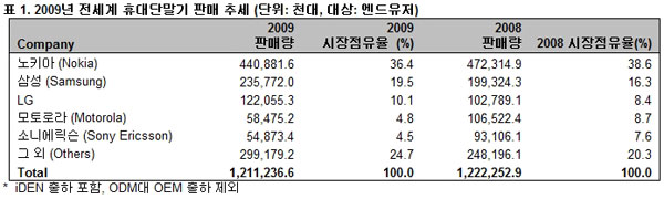 5대 휴대전화 업체 중 3개 업체가 2009년에 판매량 감소를 경험했다. 이 결과, 통합 점유율이 2008년 79.7%에서 2009년에는 75.3%까지 떨어졌다.