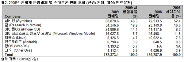 반면 2009년 전체 판매량은 12억1100만대로 전년 대비 0.9% 감소한 것으로 나타났다. 반면, 2009년 한 해 스마트폰 판매대수는 총 1억7240만 대로 전년 대비 23.8% 증가했다. 특히 애플과 RIM 등 스마트폰 중심의 기업들이 여타 경쟁업체들의 시장점유율을 잠식, 각각 14.4%, 19.9%의 스마트폰 시장점유율을 기록했다.