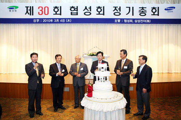 삼성전자 협성회가 창립 30주년을 맞아 3월 4일 수원에서 총회를 갖고 향후 혁신과 신뢰의 파트너십으로 지속성장을 하자는 각오를 다졌다. 삼성전자 윤주화 사장이 참석자를 대표해 건배제의를 하고 있다.(사진 왼쪽부터 윤주화 사장(삼성전자), 김홍인 대표(한국니토옵티컬), 하덕린 대표(하엠), 최지성 대표이사 사장(삼성전자), 이세용 대표(이랜텍), 권오현 사장(삼성전자).