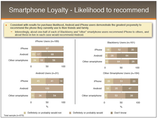 친구나 가족을 대상으로 한 추천의향에서도 아이폰과 안드로이드는 각각 97%, 100%가 현재 쓰고 있는 모델을 선호했다. 반면, 블랙베리나 타 스마트폰 이용자들의 절반 가량이 아이폰을, 약 3/10은 안드로이드를 추천, 눈길을 끌었다.