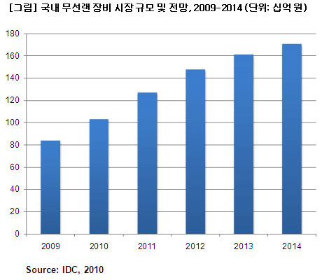 시장조사업체 한국IDC는 31일, 최근 조사 결과를 통해 올해 국내 무선랜 장비 시장 규모가 2009년 대비 23% 증가한 1033억원 규모를 기록할 것으로 예상했다. 2009년 국내 무선랜 장비 시장 규모는 2008년 대비 22.2% 증가한 839억원으로 집계됐다.