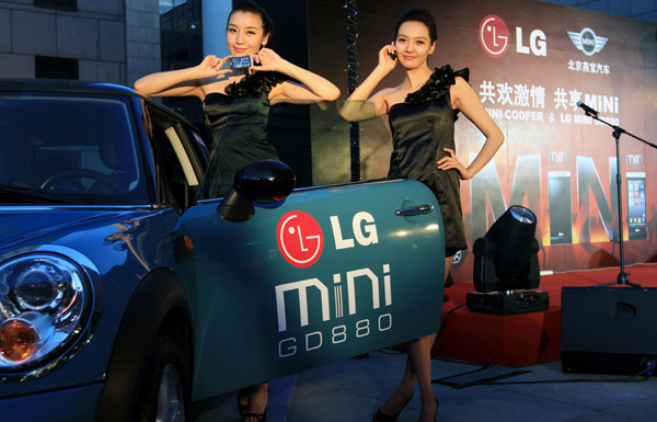 LG전자가 ‘미니’ 휴대폰을 중국에 출시하며, ‘미니 쿠퍼’와 함께 ‘미니쇼’를 여는 등 이색 마케팅을 펼쳤다. 지난 6일 일요일 중국 베이징 시내 ‘솔라나 블링 클럽’에서 검정색 미니 드레스를 입은 여성 모델들이 LG ‘미니’휴대폰, ‘미니 쿠퍼’와 함께 포즈를 취하고 있다.