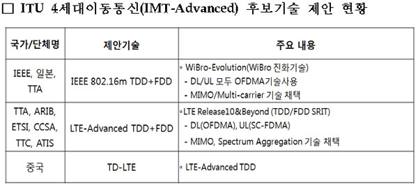 국내에서는 작년 10월 한국정보통신기술협회(TTA)가 IEEE, 일본과 와이브로 에볼루션 기술을, ARIB, ETSI 등과 LTE어드밴스드 후보 기술을 제안했다. 중국이 제안한 TD-LTE 경우, LTE 어드밴스드 기술 일환이라는 게 방통위측 설명이다.