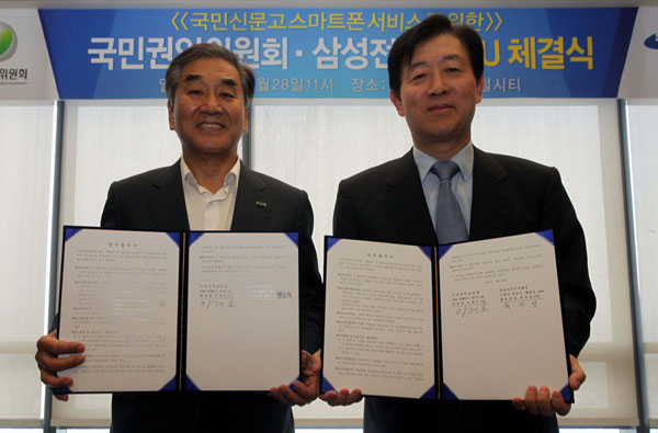 삼성전자와 국민권익위원회는 28일 수원사업장에서 ‘국민신문고 스마트폰 서비스’를 위한 업무협약식을 가졌다고 밝혔다.