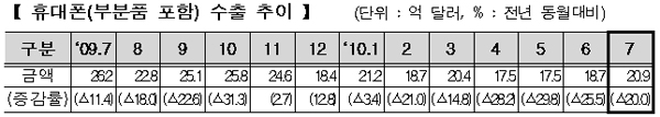이에 반해 휴대폰은 수출 단가 하락과 글로벌 경쟁 심화로 수출 실적이 20억 9000만 달러로 전년동월대비 20% 감소했다. 지경부는 그러나, 6월 이후 본격적인 스마트폰 출시 확대로 전월 대비로는 2개월 연속 증가세를 기록했다고 설명했다.