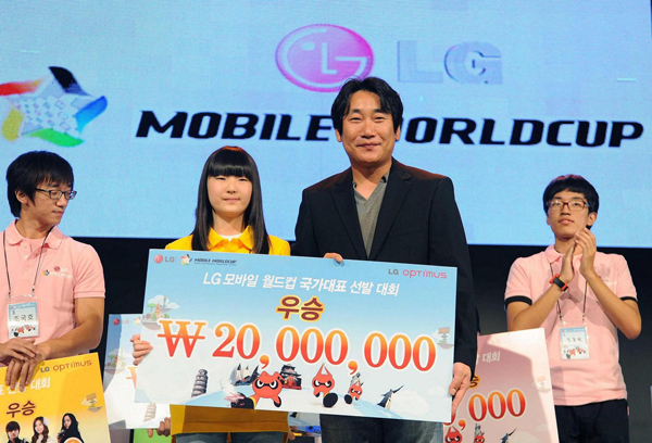 김의진 양(가운데 왼쪽)이 29일 용산 아이파크 e스포츠 스테디움에서 열린 'LG모바일월드컵 2010' 한국대표로 선발돼 상금 2000만원을 부상으로 받았다. 사진 가운데 오른쪽은 LG전자 MC한국사업부 조윤상 부장.