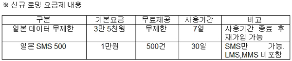 ‘일본 데이터 무제한 요금제’는 고객이 일본 출장이나 여행 중에도 무선데이터를 무제한으로 이용할 수 있는 데이터로밍 정액형 요금제로, 15일부터 제공된다. 기본요금은 3만 5천원이며, 이용기간은 7일이다. 각종 모바일 인터넷 서비스 및 LMS(장문 문자), MMS(사진, 동영상 등 멀티미디어 문자) 등 이용이 모두 포함된다.(정보이용료는 제외)