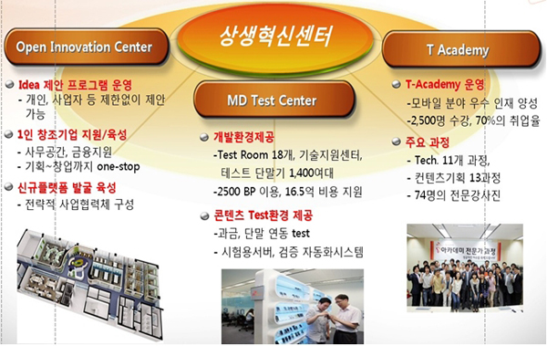 SK텔레콤의 상생혁신센터는 창업지원 종합센터인OIC(Open Innovation Center)를 중심으로 모바일 IT전문인력 양성을 담당하는 T아카데미와 콘텐츠 개발환경 지원을 담당하는 MD 테스트센터로 통합 구성돼 있다.