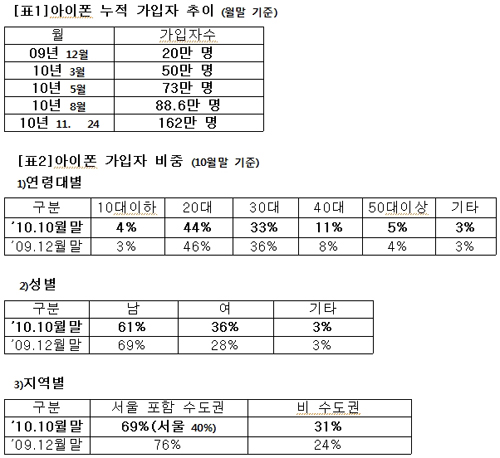아이폰은 국내 스마트폰 가입자 증가도 이끌어 국내 스마트폰 가입자수는 10월 기준 약 570만명으로 아이폰 도입 전에 비해 약 12배 증가했다. 국내 전체 휴대폰 중 스마트폰 판매 비중은 아이폰 도입 전 3% 미만에서, 10월 기준 약 40% 수준으로 급증했다.