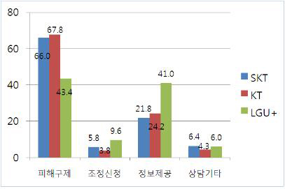 피해유형별 가입자 100만명당 접수 건수는 부당요금청구, 약정불이행 등 대부분의 유형에서 KT, LG유플러스, SK텔레콤 순이었지만, 통신 품질 미흡에서는 KT, SK텔레콤, LG유플러스 순으로 집계됐다.