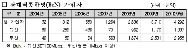 광대역통합망구축 사업은 2003년 5월 구축기획단을 발족해 ‘BcN 구축 기본계획’을 마련하고 ’04년부터 ’10년까지 7년간 추진해온 사업이다.