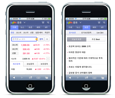 다음커뮤니케이션즈는 10일, 모바일을 통해 최근 주식동향 확인과 증권, 금융 콘텐츠를 이용할 수 있는 ‘모바일 증권(m.stock.daum.net)’서비스를 개편했다고 밝혔다.