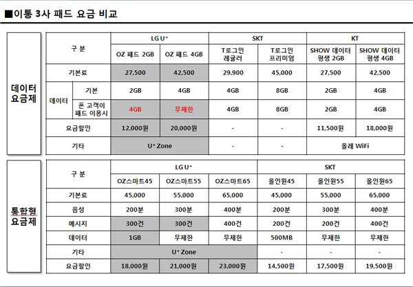 패드 구입 가격에서는 SK텔레콤 대비 LG유플러스가 유리하다. 가령, 데이터 무제한이 적용되는 ’55,000원’ 요금제(SKT: ‘올인원55’, LG U+: OZ스마트55)에서 36개월 약정시 LG유플러스가 무료인 반면, SK텔레콤은 3만 6000원 추가 비용 부담이 있다.