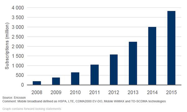 에릭슨은 12일, 전세계 모바일 브로드밴드 가입자 수가 지난해 5억명을 돌파했으며, 올해 2배 증가한 10억명에 이어 2015년까지 38억 명에 달할 것으로 전망했다.