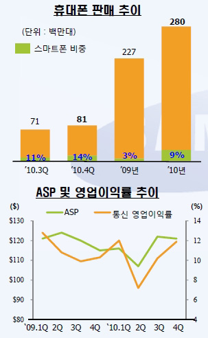 삼성전자는 28일, 2010년 실적발표를 통해 통신 부문 경우, 스마트폰 판매 확대로 두 자릿수 영업이익률(10.4%)을 유지했으며, 역대 최대규모인 2억 8000만대의 휴대전화를 판매, 시장점유율이 지속 증가했다고 밝혔다.