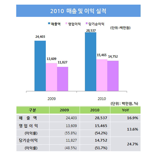 특히 회사측은 2010년 부분유료화 매출이 전체 매출의 47%에 달하는 등 변화하는 고객들의 콘텐츠 소비 패턴을 분석하고, 대응한 점도 최대 실적을 견인한 요인이라고 덧붙였다.