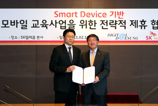SK텔레콤(대표 하성민 www.sktelecom.com)은 16일, 대성학원 디지털대성(대표 최진영 www.digitaldaesung.co.kr 이하 대성학원)과 ‘스마트 디바이스 기반 모바일 교육사업을 위한 전략적 제휴’에 대한 양해각서를 체결했다고 밝혔다.