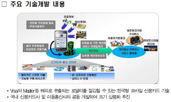 기표원은 비자와 마스터 등 해외로 유출되는 로열티를 절감할 수 있는 한국형 모바일 신용카드 지불결제 기술을 국내 신용카드사 및 이통사와 공동 개발, 이를 조기 상용화한다는 방침이다.