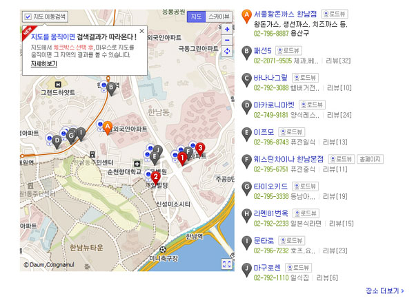 기존에 ‘한남동 맛집’이라고 검색할 경우 사용자는 한남동에 한정된 검색결과만 확인 할 수 있었으나, 이제는 ‘지도이동검색’을 통해 지도를 움직이며 다른 지역의 결과도 확인할 수 있다고 회사측은 전했다.