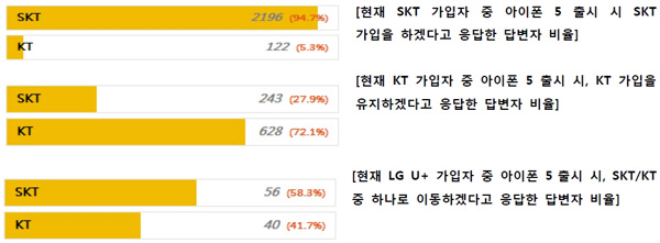 이 결과는 SKT로 아이폰5가 출시될 경우, 기존 아이폰 대기 수요자 및 사용자(가입자)들이 대거 SKT로 이동할 가능성이 높다는 점을 어느 정도 내포하고 있다는 게 회사측 분석이다.?