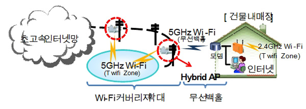 이번에 SK텔레콤이 독자 개발해 5GHz 와이파이 존 구축에 적용한 하이브리드(Hybrid) AP기술은 별도의 회선/전원 공사 없이도 실내/외에서 와이파이를 제공할 수 있는 최신 와이파이 기술이다.