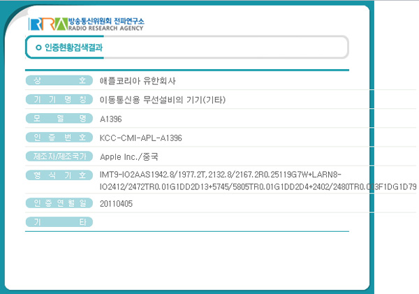 전파인증을 통과한 모델명은 ‘A1396’으로, 이는 아이패드2의 미국 FCC 인증 당시 GSM(WCDMA+WiFi) 버전을 의미한다. 애플은 A1396 외 와이파이 버전 ‘A1395’와 CDMA모델 ‘A1397’의 인증을 신청한 바 있다.