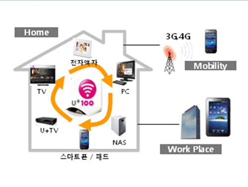고객은 집안에서는 100Mbps급 와이파이로 빠른 콘텐츠 이동이 가능하며, 외부에서는 와이파이 또는 3G 이동통신망을 선택해 집안의 PC나 태블릿PC 등에 저장된 콘텐츠를 불러올 수 있다.