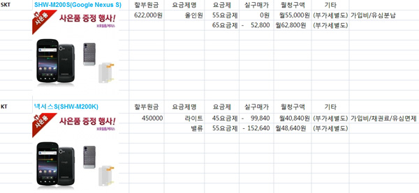 SKT 넥서스S는 55요금제와 65요금제로 실구매가 0원, -5만 2800원이다. 월청구액은 각각 5만 5000원, 6만 2800원이다. 가입비와 유심 분납이다.