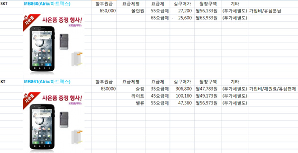 이 중 이달 초 KT와 SK텔레콤이 경쟁적으로 내놓은 모토로라 ‘아트릭스(MB861/MB860)’는 고사양 스마트폰임에도 불구, 이통사 전략적인 마케팅으로 비교적 저가로 나와 관심이 높다. 특히 KT가 보다 공격적이다. <관련기사: 모토 ‘아트릭스’ SKT 탈피 ‘뜰까?’>
