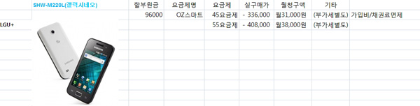 LG유플러스 스마트폰으로 가장 최근 나온 ‘갤럭시 네오(SHW-M220L)’도 판매 규모가 주목된다.<관련기사: 삼성-LG U+, ‘갤럭시 네오’ 출시> 45?55요금제 기준 실구매가 각각 -33만 6000원, -40만 8000원으로 월청구액이 3만 1000원, 3만 8000원이다. 할부원금은 9만 6000원이다.