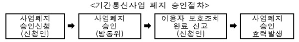 이 경우, 방통위는 이용자 보호에 필요한 조치를 명할 수 있고, 해당 사업의 휴지?폐지로 인해 공공의 이익을 해칠 우려가 있다고 판단되면 승인을 해선 안된다고 규정돼 있다.