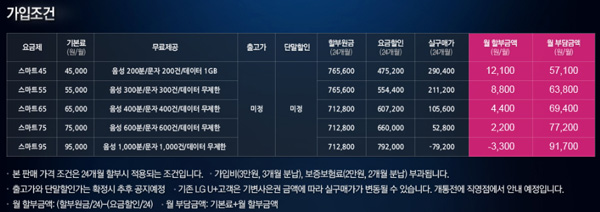 예판 가입조건에 따르면, ‘스마트55’ 요금제 경우, 2년 약정시 실구매가는 29만 400원으로, 단말 월할부금은 8800원, 월부담금액은 6만 3800원이다. KT 6만 5180원과 유사한 수준이다.