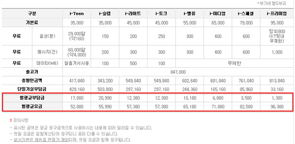 ‘i라이트’(월 45,000원)와 ‘i미디엄’(월 65,000원) 경우 월청구액은 각각 5만 7380원, 7만 1880원이다. 어느 요금제든 ‘단말 0원’은 없다.