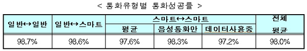 국내 이통3사 스마트폰 음성통화품질 측정 결과, 스마트폰 간 통화성공률이 일반폰보다 낮게 나타난 가운데, 특히 KT가 동일한 망내 스마트폰 종류에 따라 격차가 가장 큰 것으로 조사됐다.