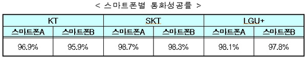 이통사별로는 동일한 망내에서 스마트폰 종류에 따라 KT가 1.0%의 차이를 보여, SK텔레콤(0.4%), LG유플러스(0.3%)보다 많은 차이를 보였다.