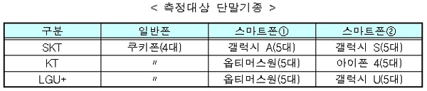평가 스마트폰은 각 이통사별로 작년 11월말 기준 가입자가 많은 2모델이 선정됐다. SKT 경우, 갤럭시A와 갤럭시S, KT는 아이폰4와 옵티머스원, LG유플러스는 옵티머스원과 갤럭시U가 그 대상이었다.