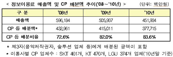 한편, ’10년도의 경우 전체 정보이용료(4,519억원)의 약 83.6%(3,777억원)가 CP와 제3자에게, 16.4%(742억원)가 이통사에게 배분된 것으로 나타났다.?