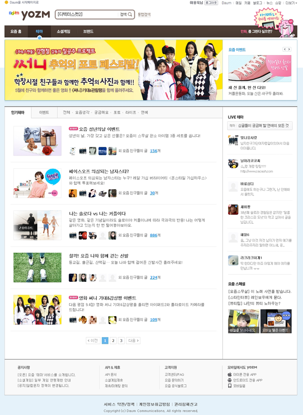 다음은 13일, 자사의 SNS 요즘(yozm)에 최근 화제가 되는 이슈 및 관심사에 대해 이야기 할 수 있는 광장인 ‘요즘 테마(http://yozm.daum.net/talk/theme)’를 오픈한다고 밝혔다.