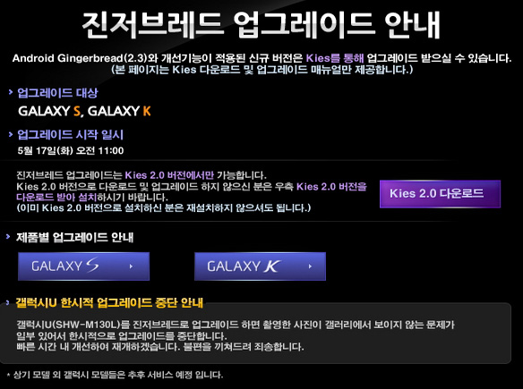 삼성전자는 17일부터 갤럭시S/K/U를 대상으로 기존 안드로이드 2.2(프로요) 버전을 2.3(진저브레드)로 업그레이드를 실시하고 있다. 이후 갤럭시A나 갤럭시탭 등으로 점차 확대한다는 계획이다.<관련기사: 삼성 ‘갤럭시’ 진저브레드 업그레이드>