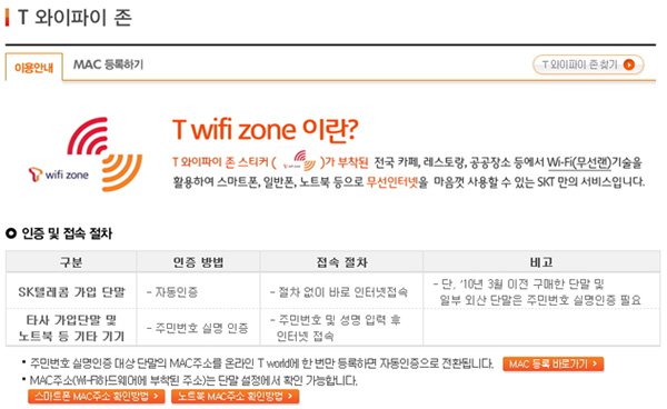 기존 타사 가입자가 T와이파이 존을 이용하기 위해서는 매번 주민등록번호와 이름을 입력, 이용하는 방법과 온라인 상 T월드에서 단말 정보(MAC주소)를 입력 상시적으로 접속하는 방법이 이용됐다.