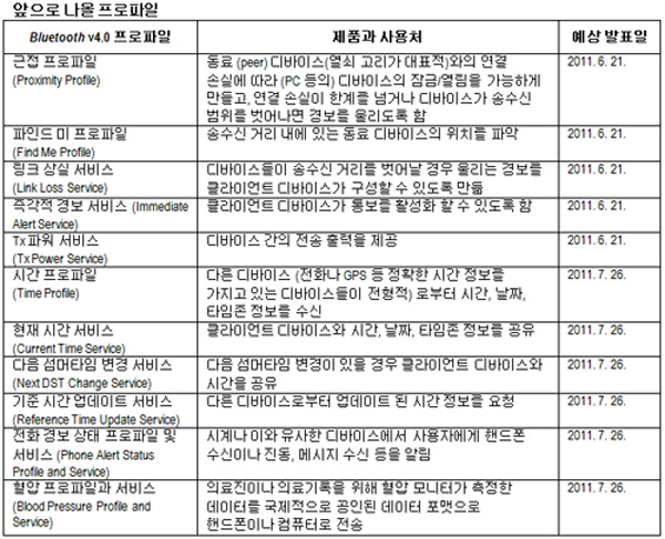 블루투스 v4.0 기술은 올해 4/4분기부터 스마트폰에 내장되기 시작해, 2012년 말에는 100%의 스마트폰에 탑재될 것으로 블루투스SIG는 전망했다.