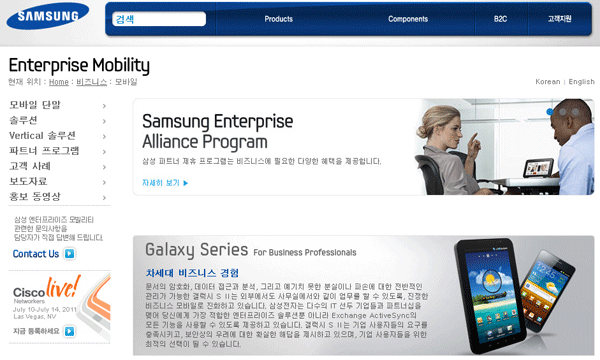 삼성전자는 27일, 기업 고객을 위한 웹사이트 ‘엔터프라이즈 모빌리티’의 한국어 홈페이지(www.samsung.com/sec/enterprise)를 공개했다고 밝혔다.